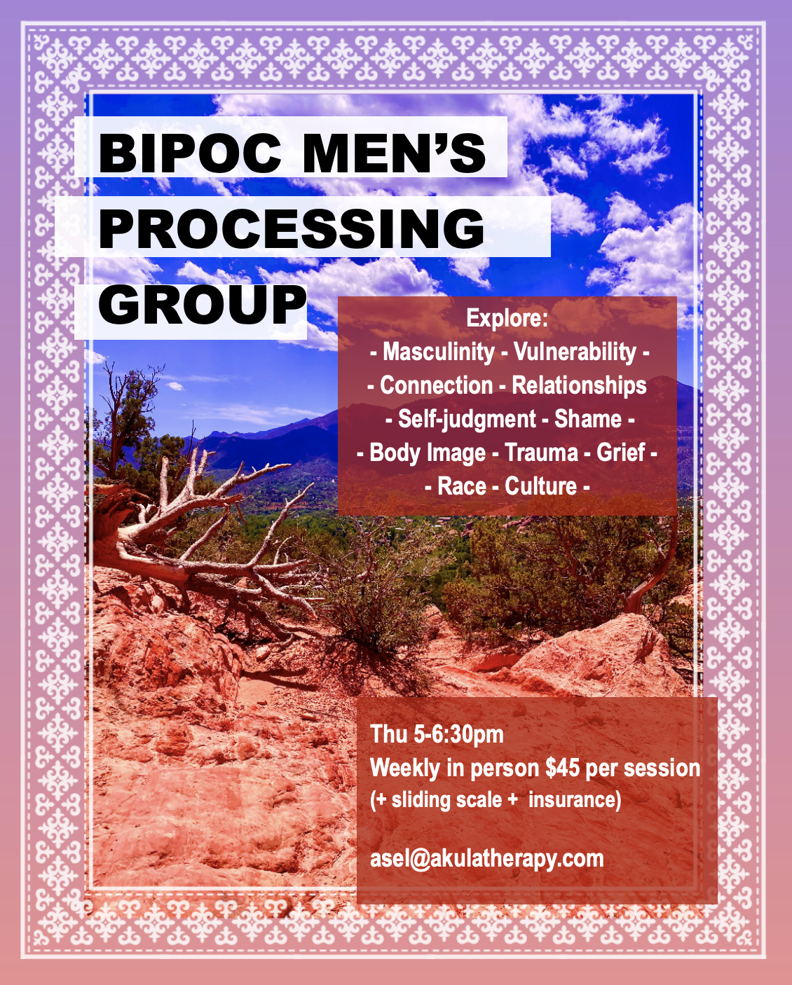 The group is for folks who identify as male and is a space where folks can practice relational skills, vulnerability, being authentic, connecting to body, connecting to emotions, processing trauma/grief, and addressing shame/judgement. We will explore masculinity, social norms, hurt, anger, expectations, mental health, relationships, family, self-esteem, body image, parenting, upbringing, and needs.